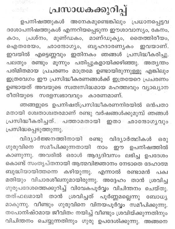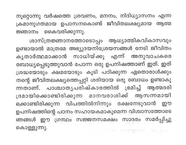 ശാസ്ത്രജ്ഞാനത്തോടൊപ്പം ആധ്യാത്മികവികാസവും ഉണ്ടായാല് മാത്രമേ ജീവിതം കൃതാര്ത്ഥമാക്കാന് സാധിക്കൂ എന്നു ബോധ്യപ്പെടുത്താന് പോന്ന ഒരു ഉപനിഷത്താണ് ഇത്. പാശ്ചാത്യപരിഷ്കാരത്തില് ഭ്രമിച്ച് ആത്മദരിദ്രമായിക്കൊണ്ടിരിക്കുന്ന മാനവരാശിക്ക് ഈ ഉപനിഷത്തിന്റെ പഠനം സഹായകമാകും